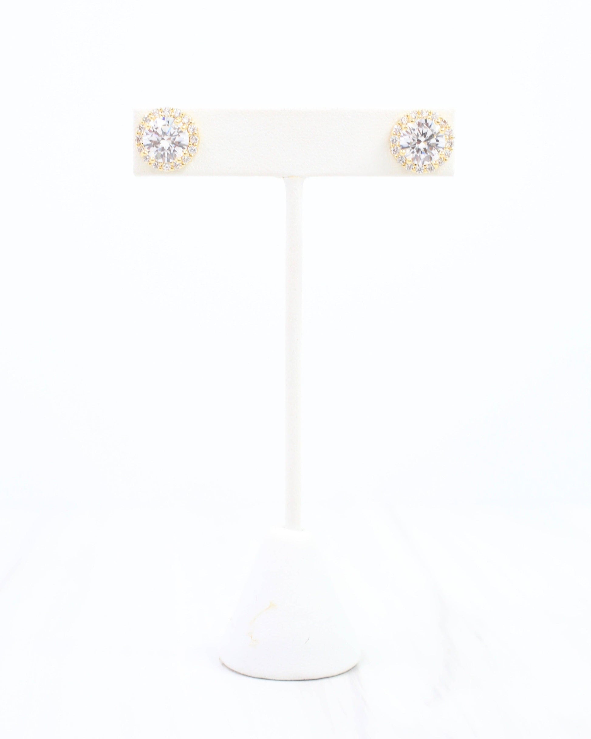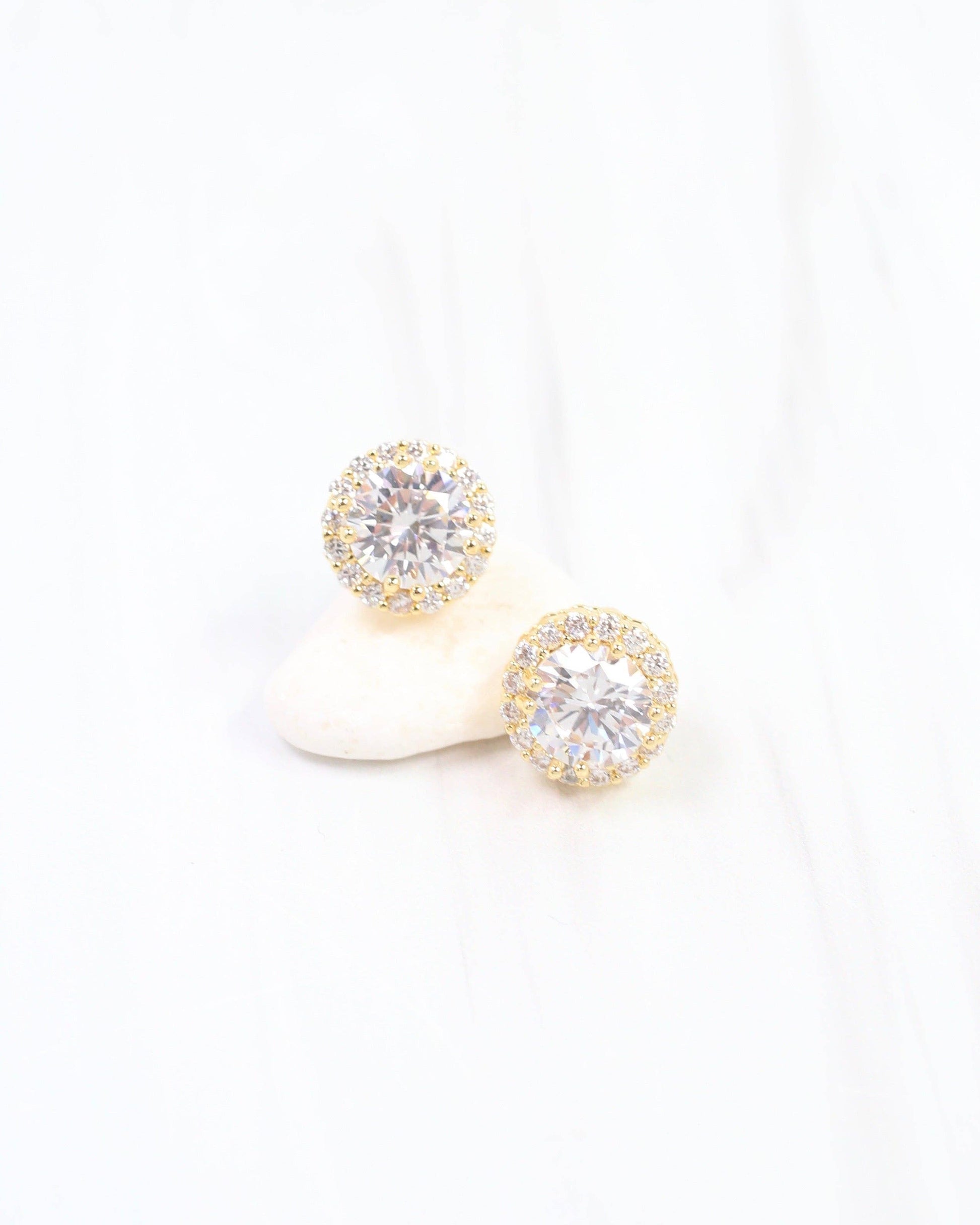 Featuring a dazzling large center stone surrounded by a twinkling halo of smaller crystals, these round studs shine bright with gold-dipped trim and posts.