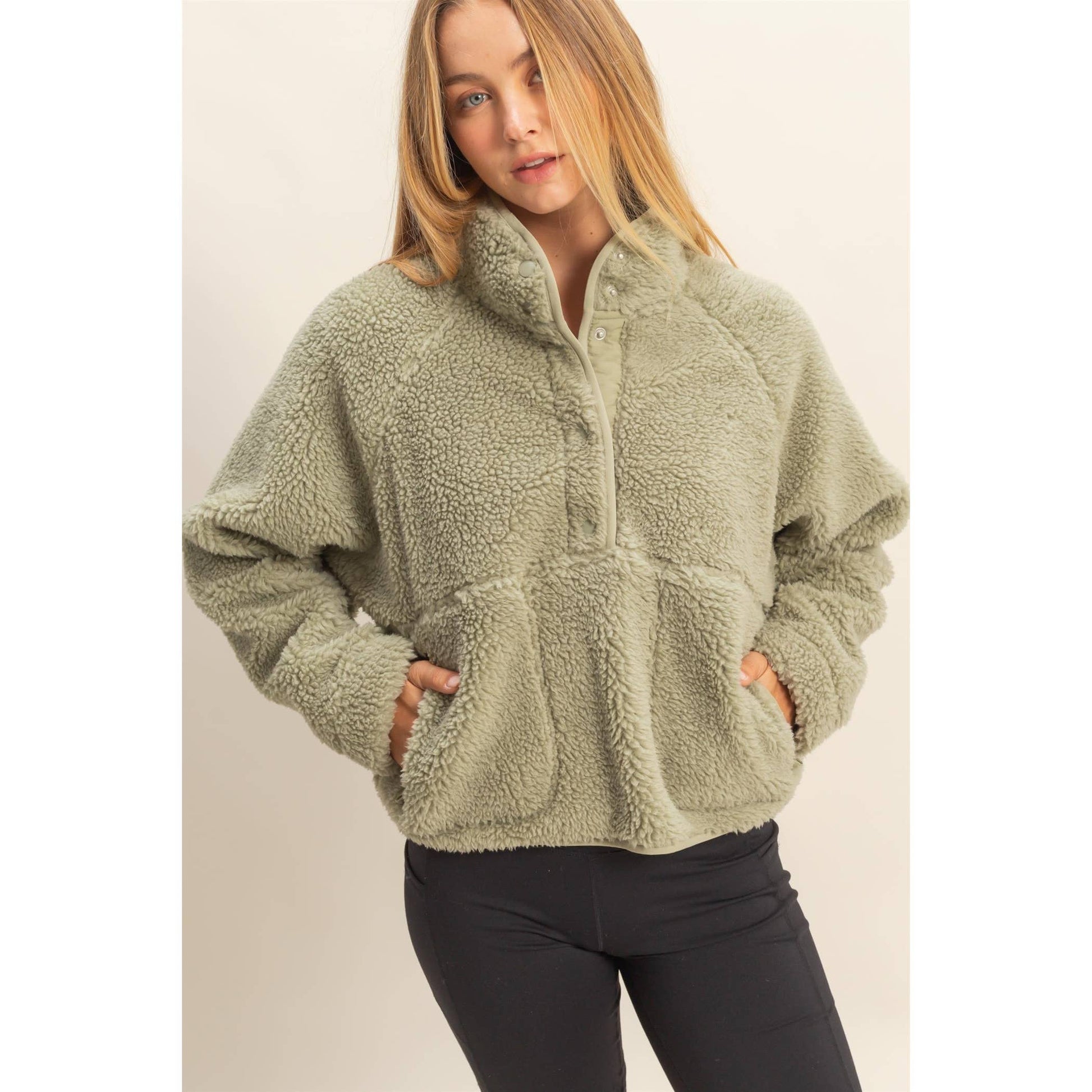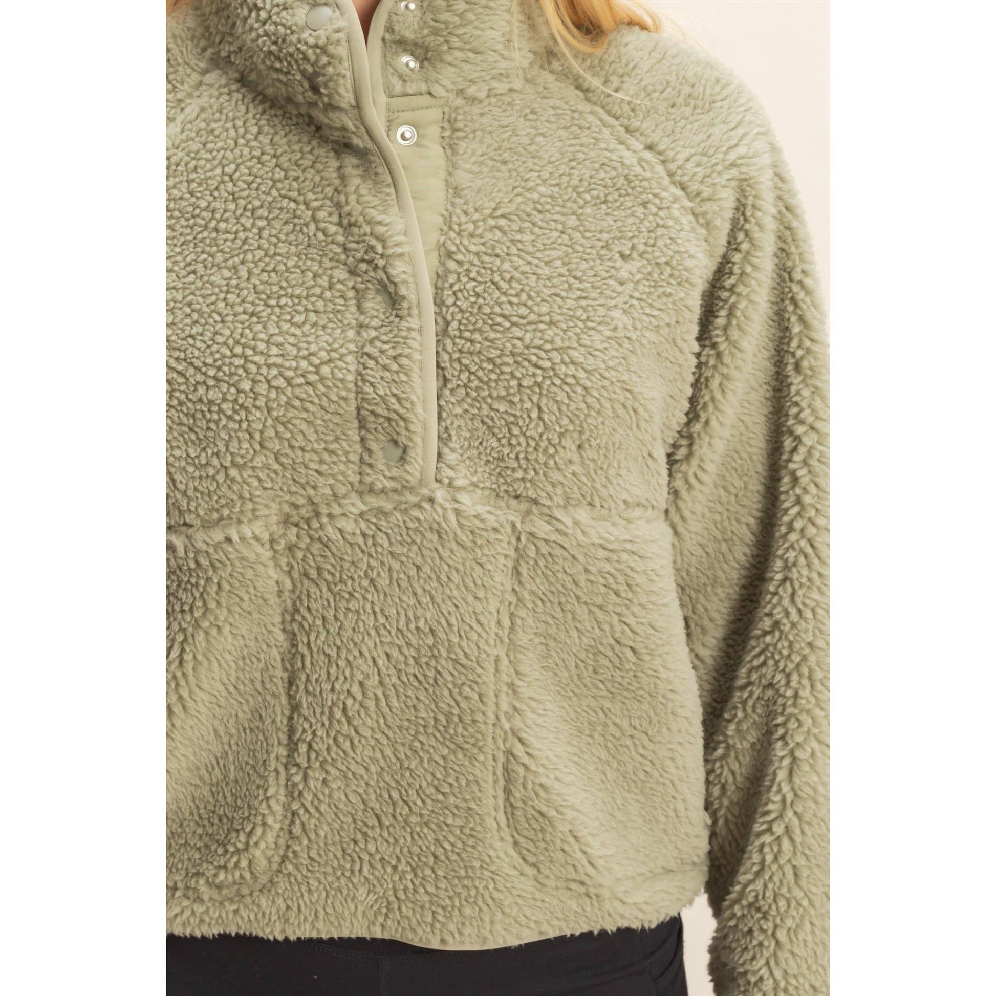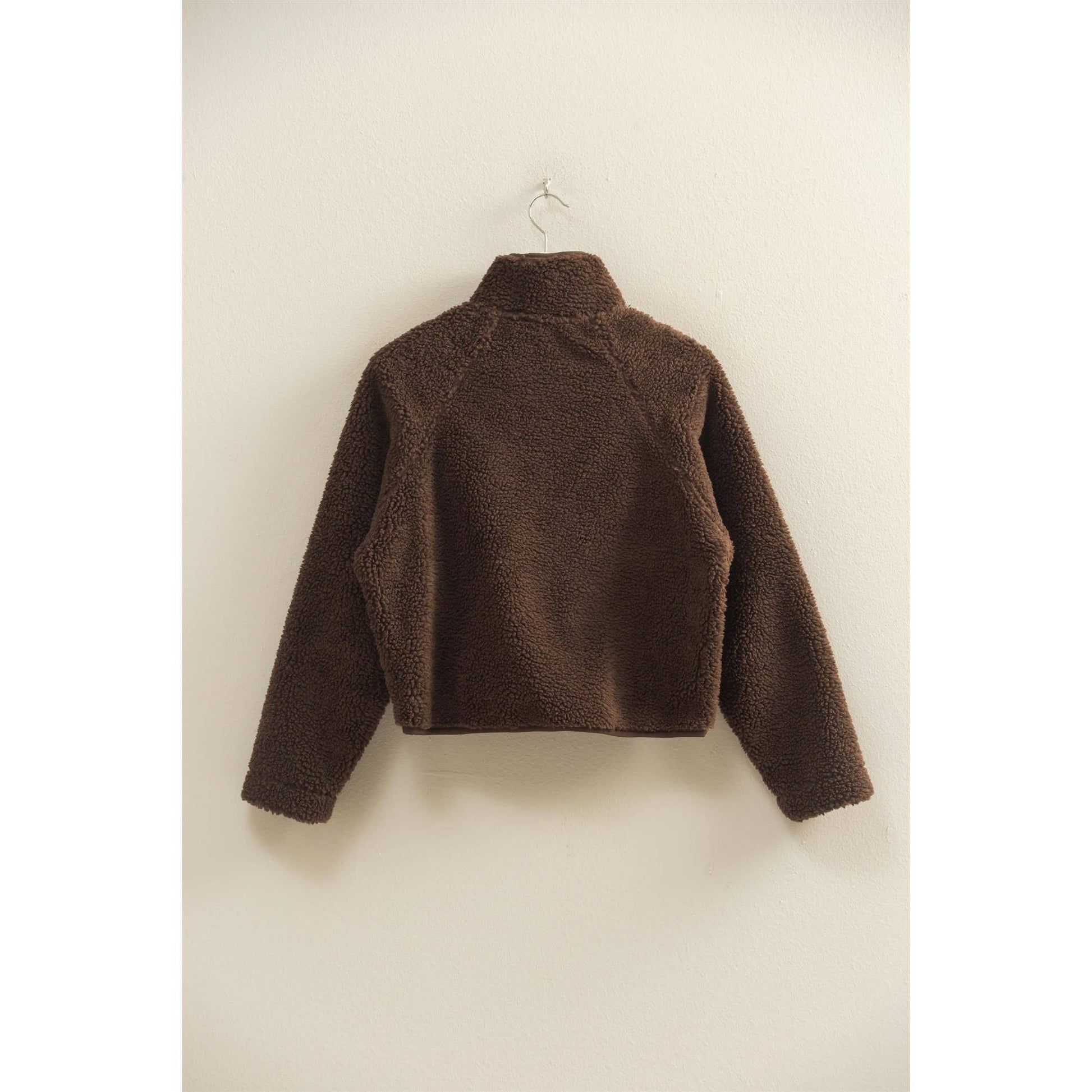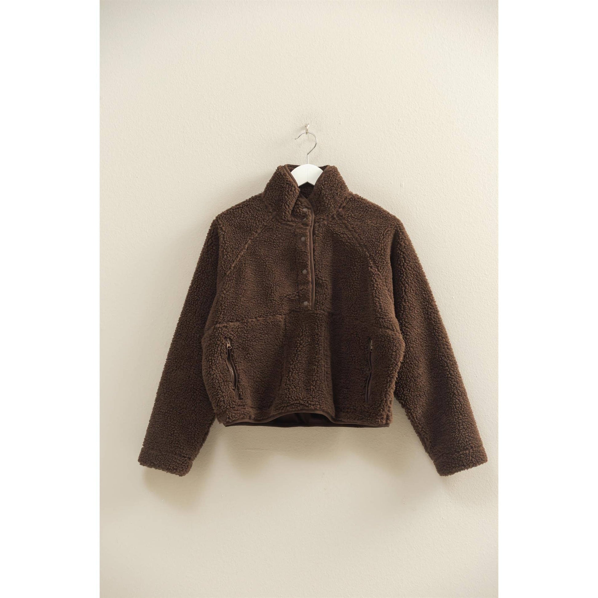 Wrap yourself in comfort with the Cozy Sherpa Half Snap Jacket, your new go-to for staying warm in style. Made from ultra-soft 100% polyester sherpa, this jacket features a high-collar design and plush texture that keeps the chill out while offering unbeatable coziness. The half-snap front allows for easy layering, while functional front pockets add both style and convenience.