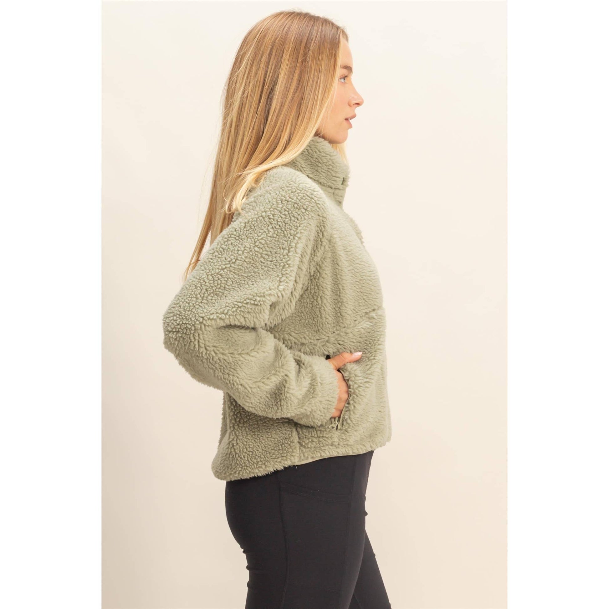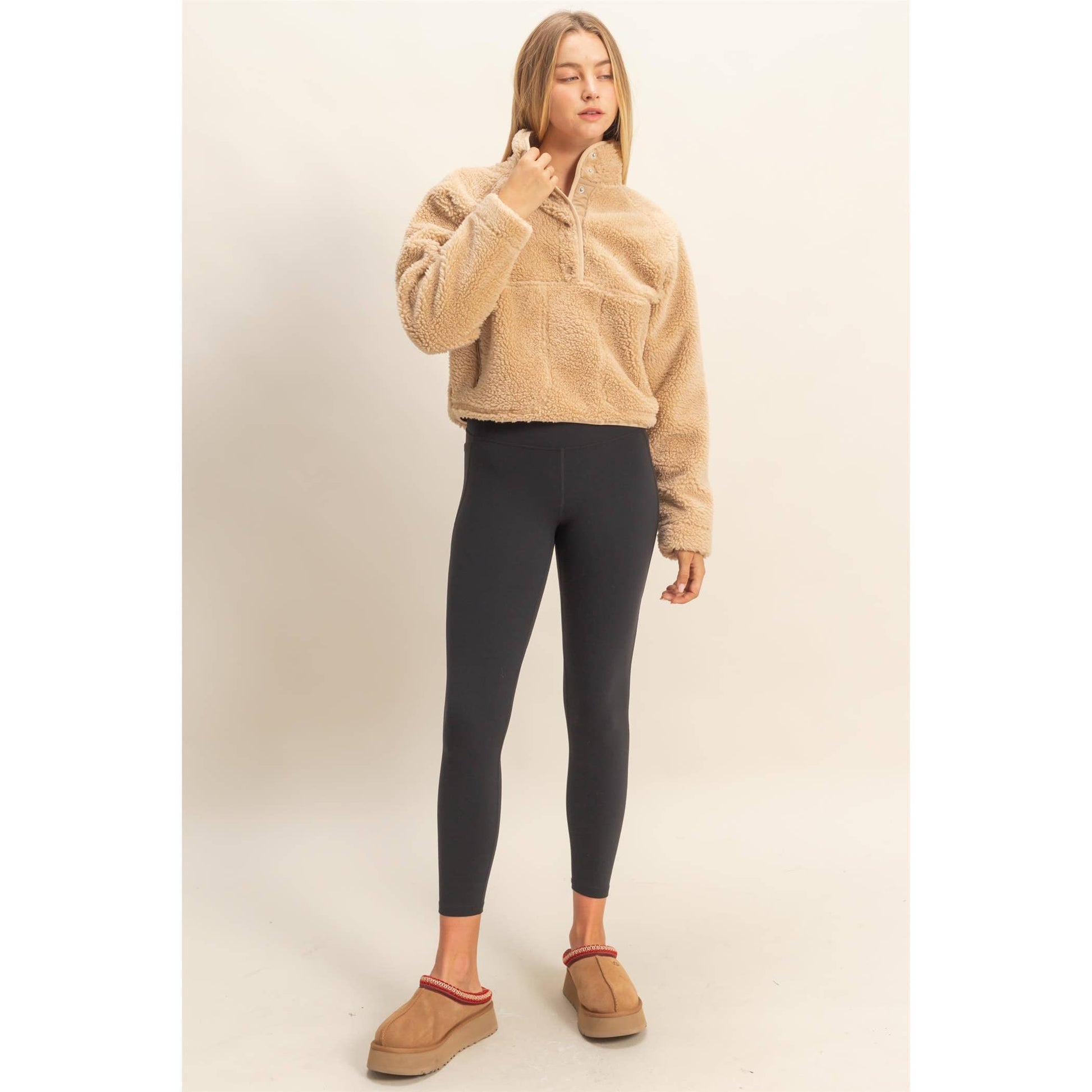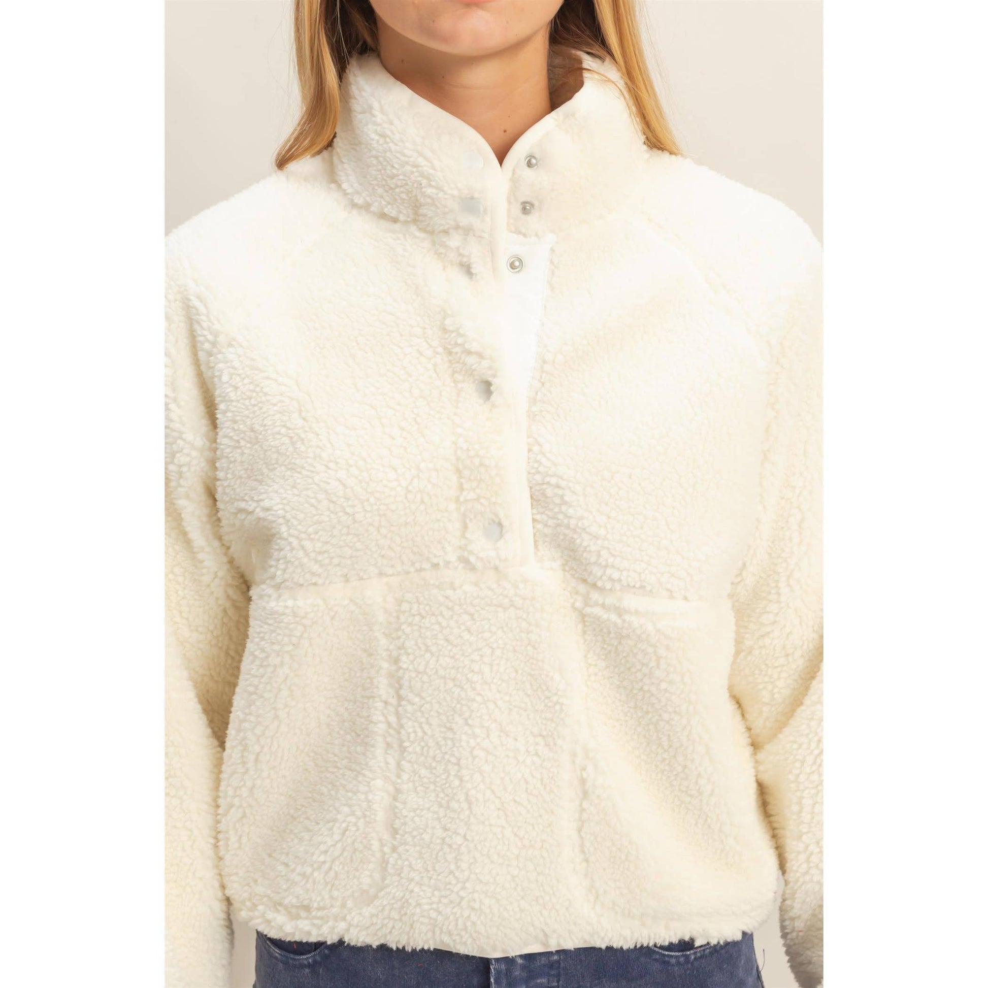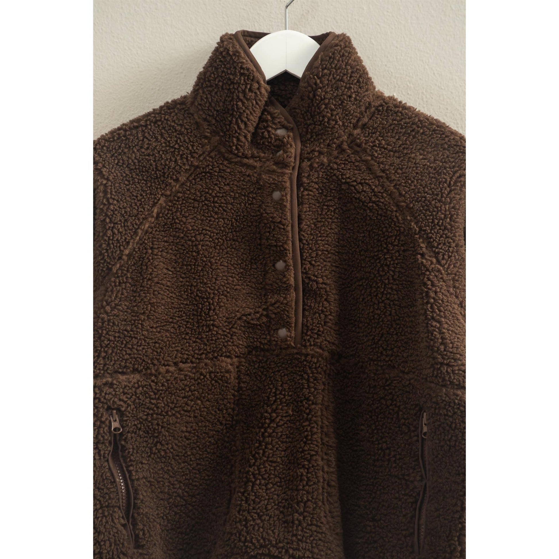 Wrap yourself in comfort with the Cozy Sherpa Half Snap Jacket, your new go-to for staying warm in style. Made from ultra-soft 100% polyester sherpa, this jacket features a high-collar design and plush texture that keeps the chill out while offering unbeatable coziness. The half-snap front allows for easy layering, while functional front pockets add both style and convenience.