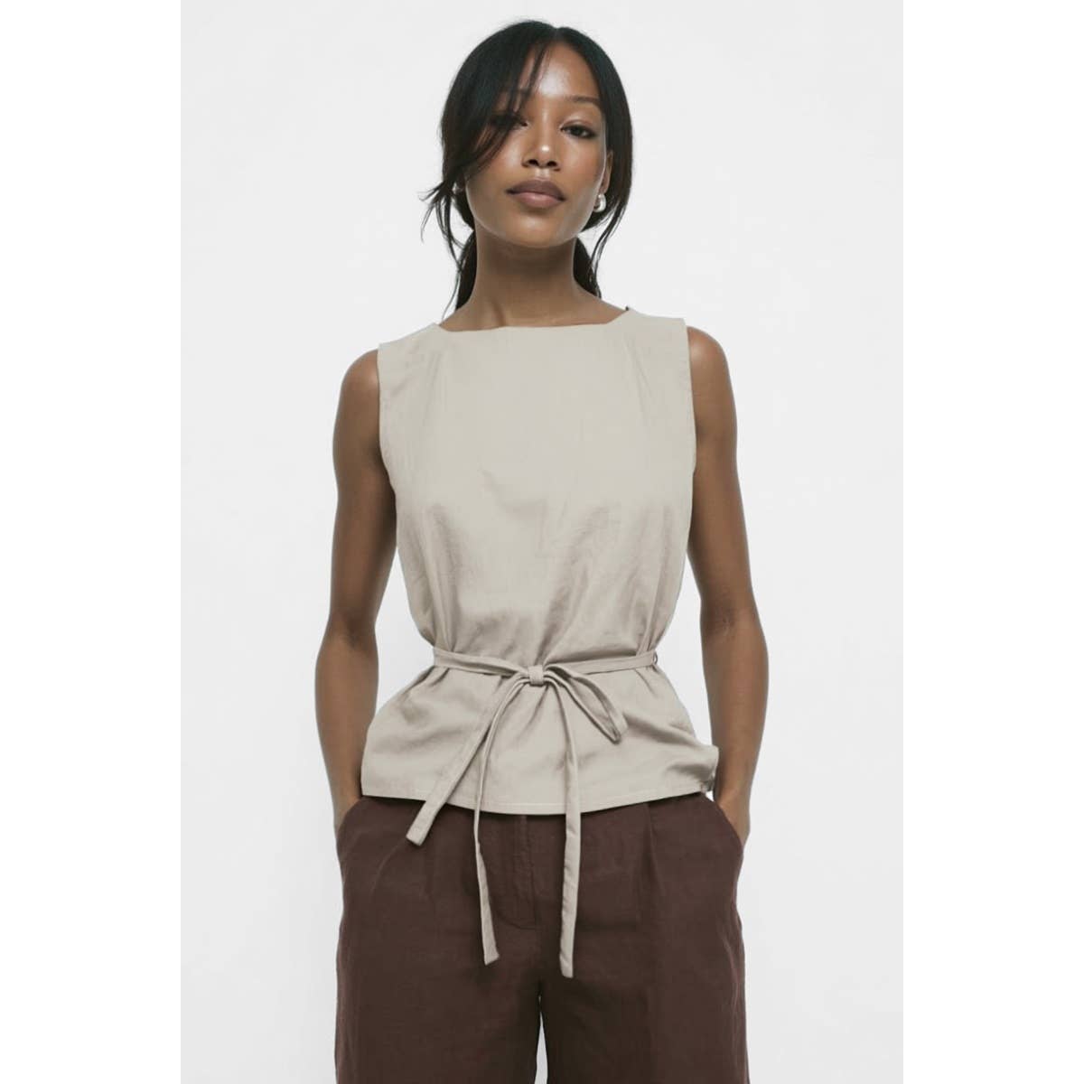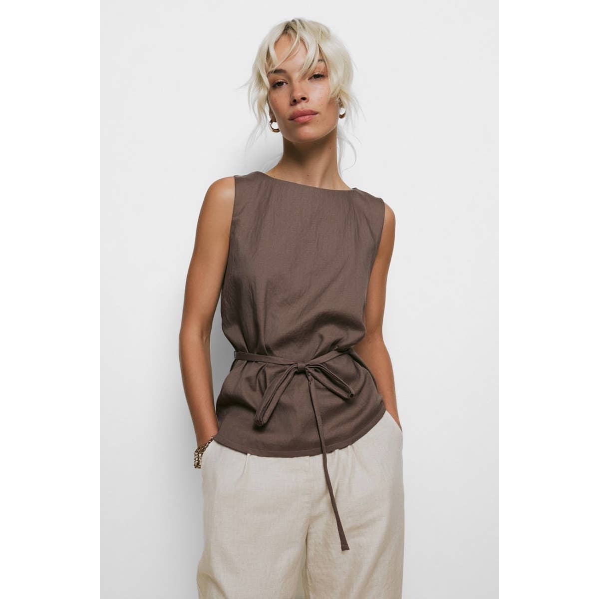 Embrace effortless elegance with our Sleeveless Cinched Tunic Top, crafted from a lightweight linen-look fabric that feels breezy and comfortable all day long. Featuring a flattering boat neckline and a delicate waist tie, this tunic offers subtle shaping while maintaining a relaxed silhouette. Perfectly pairs with tailored trousers for the office or your favorite denim for a casual-chic vibe.